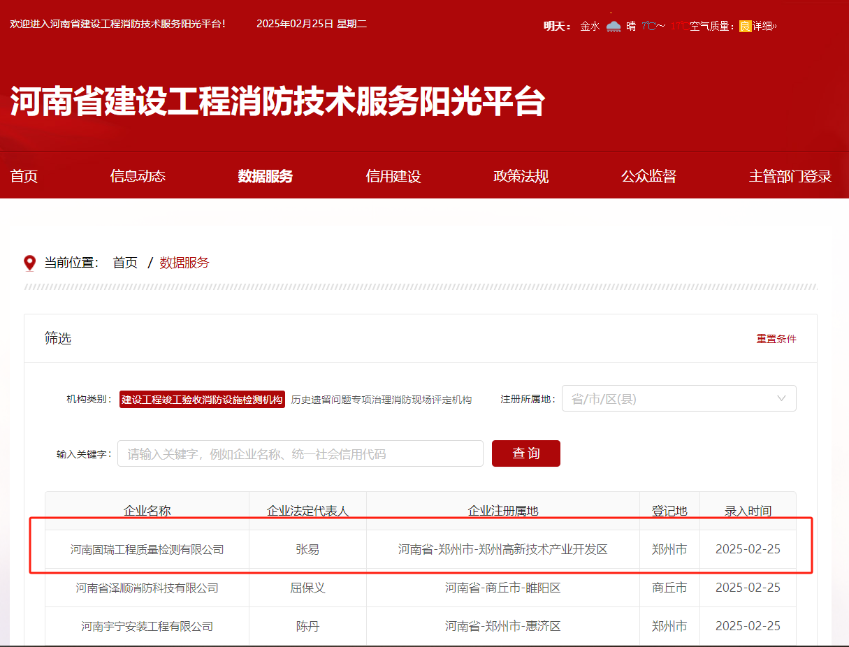 熱烈祝賀河南固瑞工程質量檢測有限公司入冊河南省建設工程消防技術服務陽光平臺!??!